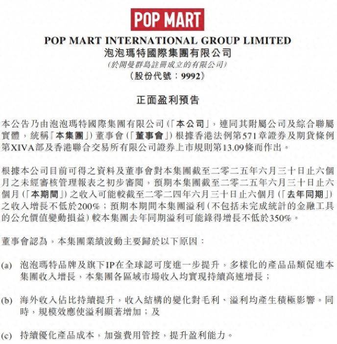 | 7月15日晚间,泡泡玛特(09992.HK)发布靓丽的业绩预告,称集团2025年上半年(截至2025年6月30日止)收入预计同比增长不低于200%;集团溢利(不包括未完成统计的金融工具的公允价值变动损益)预计同比增长不低于350%。 ![]() 和一季度环比来看,今年一季度,泡泡玛特整体收益同比增长165%~170%,其中中国收益同比增长95%~100%,海外收益同比增长475%~480%。海外各区域收益方面,亚太(指中国以外的其他亚洲及大洋洲国家和地区)同比增长345%~350%,美洲同比增长895%~900%,欧洲同比增长600%~605%。对照上半年的整体增速,泡泡玛特第二季度业绩也很不俗。 从去年同期来看,2024年上半年,泡泡玛特实现营收45.58亿元,归母净利润为9.21亿元。按照预告的增速,泡泡玛特今年上半年营收至少达137亿元,归母净利润不低于41亿元。 关于业绩波动,泡泡玛特归纳为三个原因:一是泡泡玛特品牌及旗下IP在全球认可度进一步提升,多样化的产品品类促进收入增长,各区域市场收入均实现持续高速增长; 二是海外收入占比持续提升,收入结构的变化对毛利、溢利均产生积极影响。同时规模效应使溢利显著增加; 三是持续优化产品成本,加强费用管控,提升盈利能力。 值得注意的是,市场对泡泡玛特的预期业绩表现得很“冷静”。7月16日,截至发稿,泡泡玛特股价跌4.56%,报251.2港元/股,总市值达3373亿港元。 来源:读创财经 |